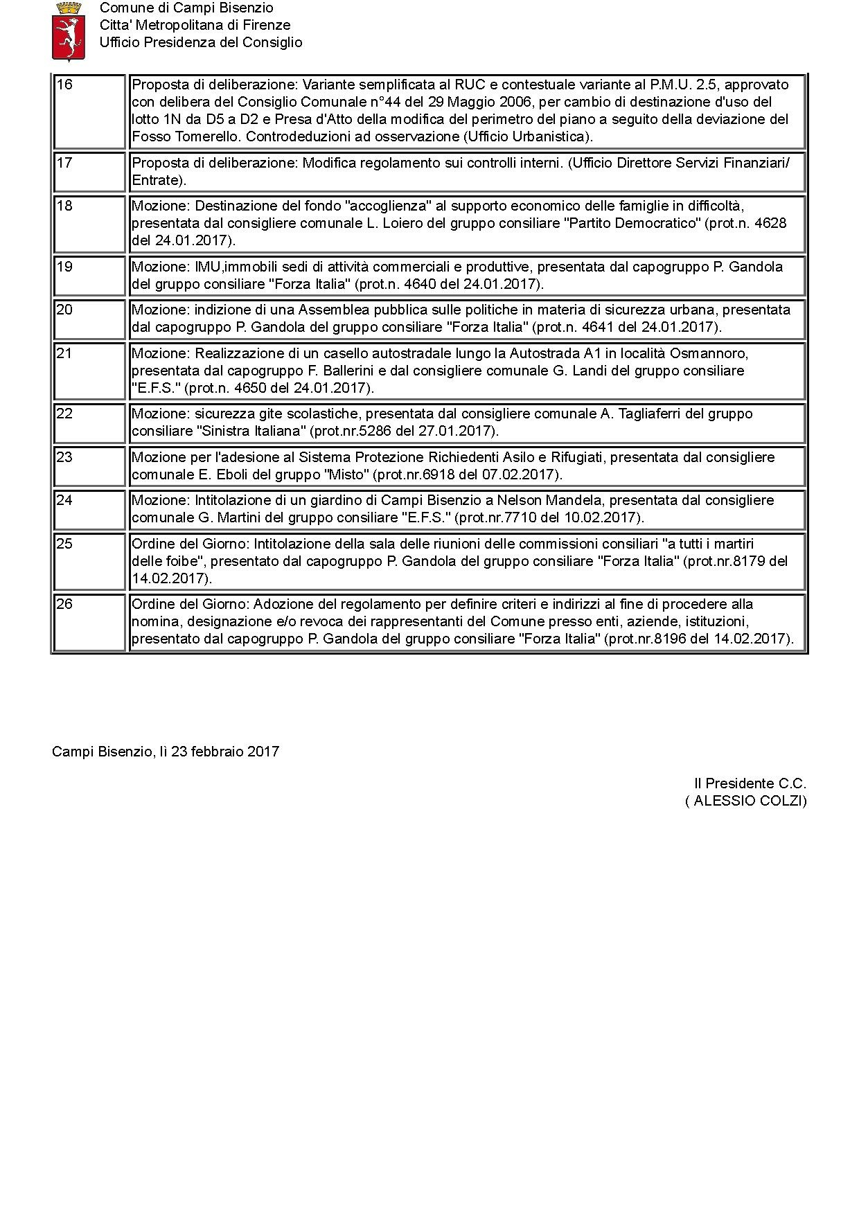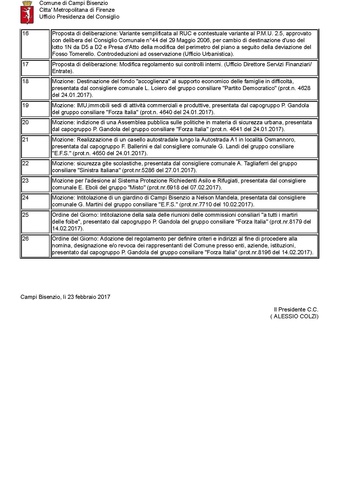 Comune di Campi Bisenzio - Convocazione in seduta pubblica del CONSIGLIO COMUNALE per il giorno GIOVEDI' 02 MARZO 2017 alle ore 17:00 - ORDINE DEL GIORNO