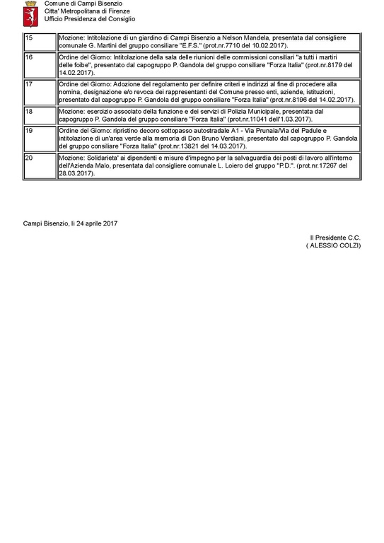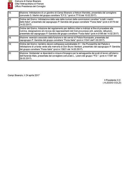 Il Consiglio Comunale di Campi Bisenzio è convocato per il giorno GIOVEDI' 27 APRILE 2017 alle ore 17:00 - ORDINE DEL GIORNO