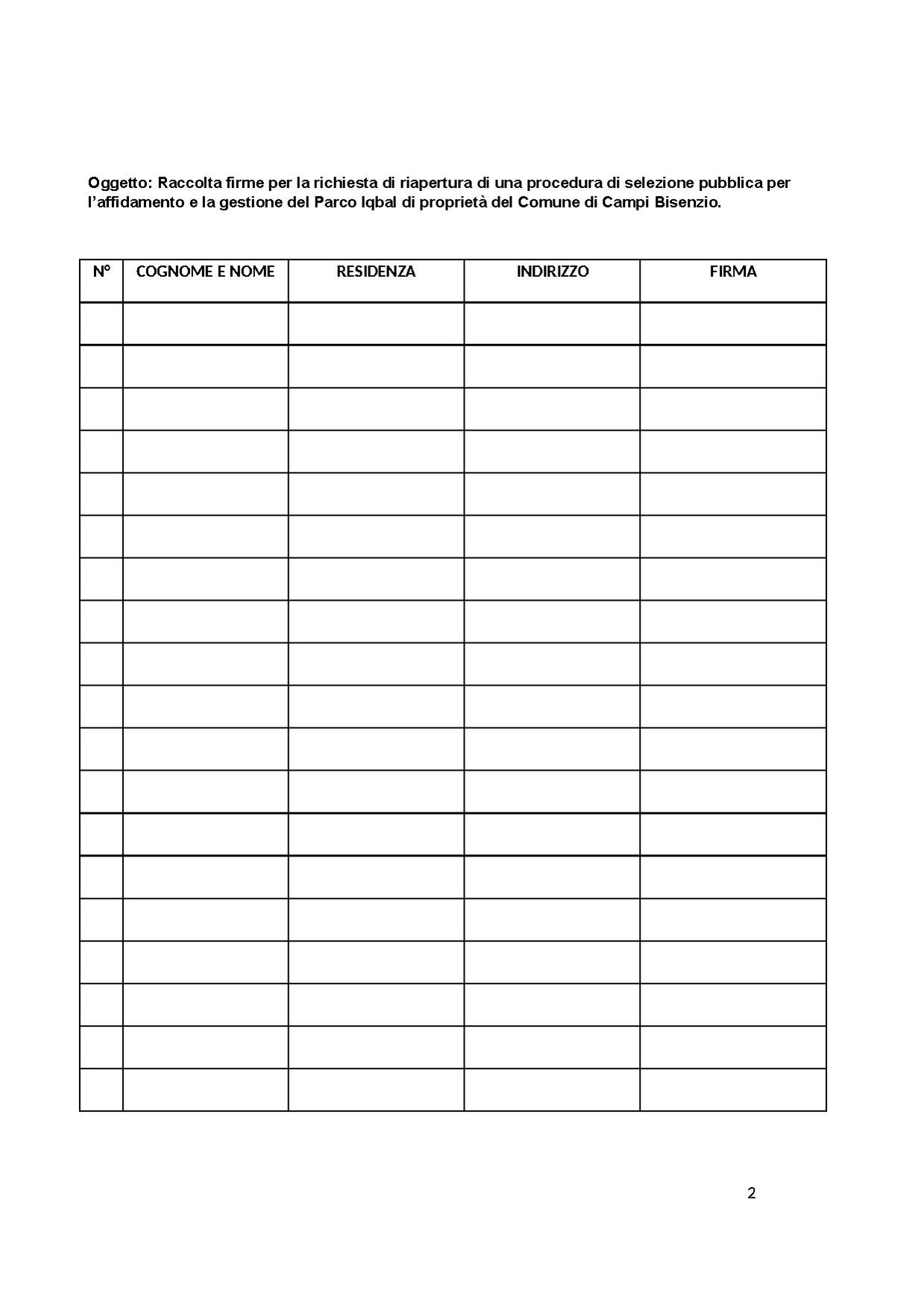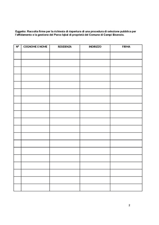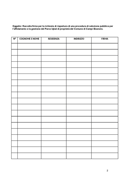 Raccolta firme per la richiesta di riapertura di una procedura di selezione pubblica per l’affidamento e la gestione del Parco Iqbal di proprietà del Comune di Campi Bisenzio.