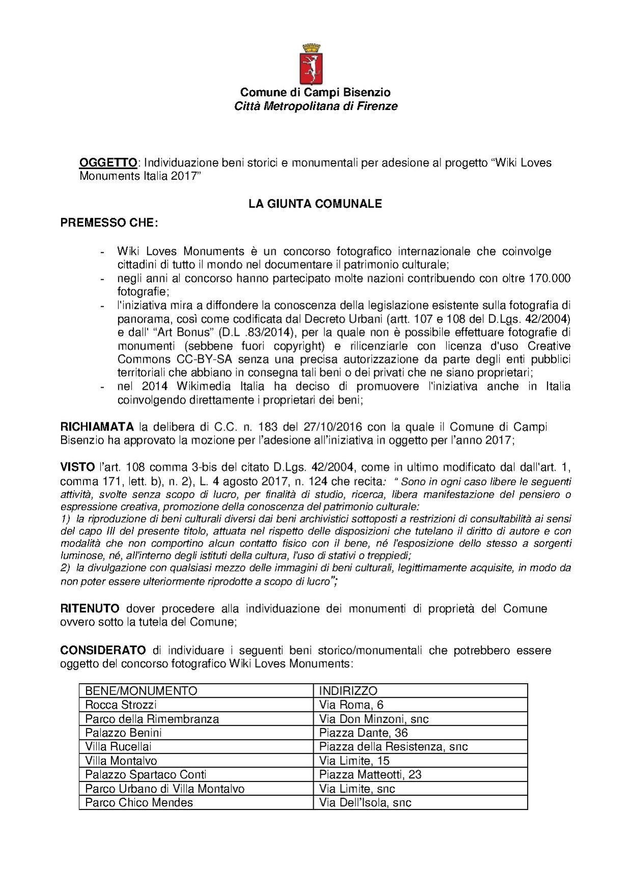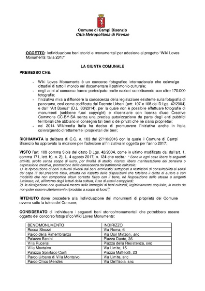 DELIBERAZIONE DELLA GIUNTA COMUNALE N. 125 DEL 19/09/2017 Individuazione beni storici e monumentali per adesione al progetto “Wiki Loves Monuments Italia 2017”.