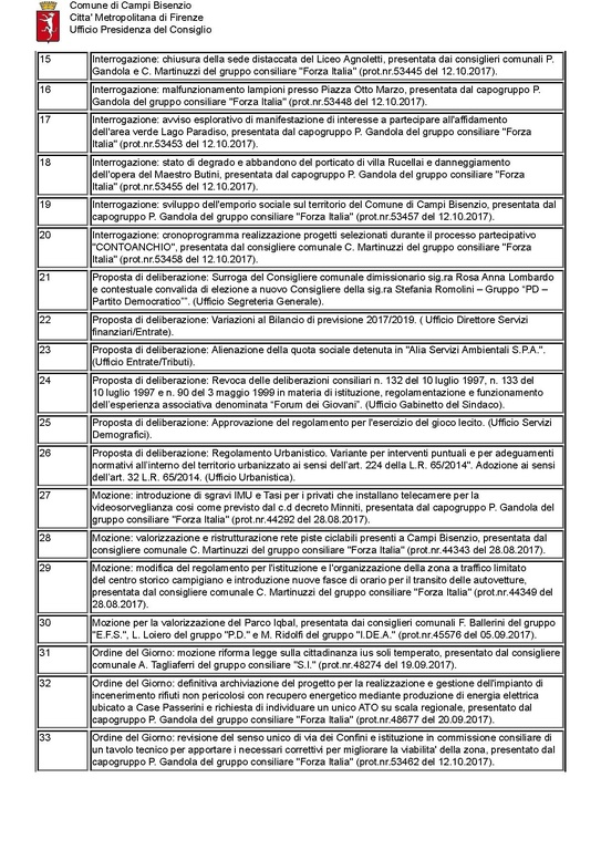 Comune di Campi Bisenzio - Convocazione in seduta pubblica del CONSIGLIO COMUNALE per il giorno GIOVEDI' 19 OTTOBRE 2017 alle ore 16:30 - ORDINE DEL GIORNO.
