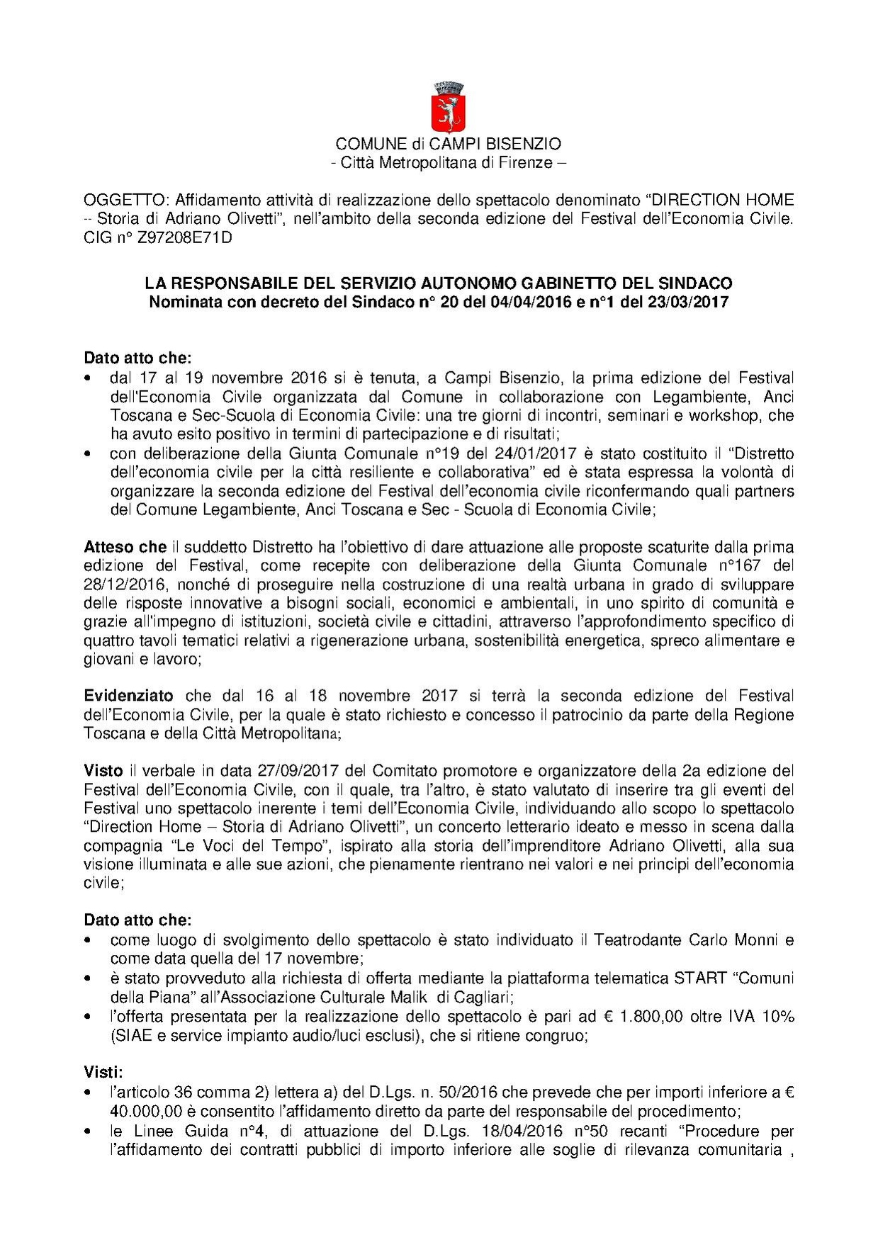 Comune di Campi Bisenzio - DETERMINAZIONE N. 837 DEL 2017-11-02 - Affidamento attivita di realizzazione dello spettacolo denominato ?DIRECTION HOME -- Storia di Adriano Olivetti?, nell?ambito della seconda edizione del Festival dell?Economia Civile. CIG n? Z97208E71D