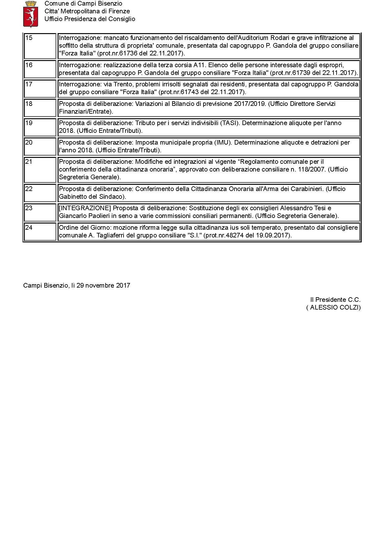 Convocazione in seduta pubblica del CONSIGLIO COMUNALE per il giorno GIOVEDI' 30 NOVEMBRE 2017 alle ore 17:00 - ORDINE DEL GIORNO