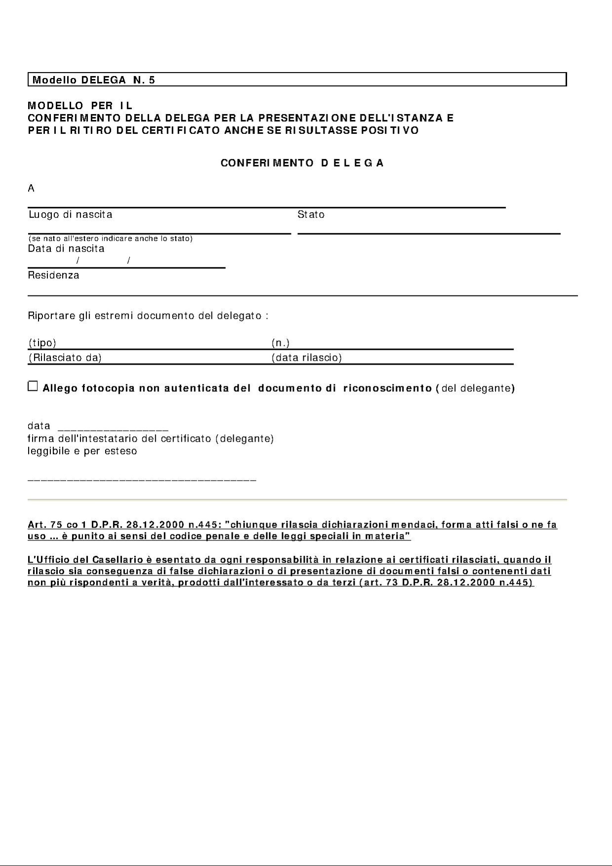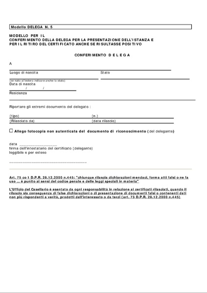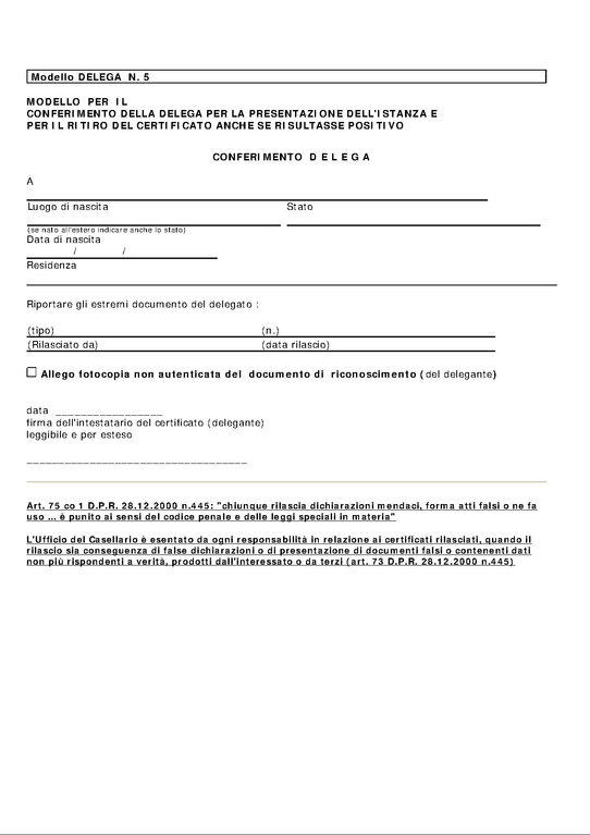MODELLO PER IL CONFERIMENTO DELLA DELEGA PER LA PRESENTAZIONE DELL'ISTANZA E PER IL RITIRO DEL CERTIFICATO ANCHE SE RISULTASSE POSITIVO
