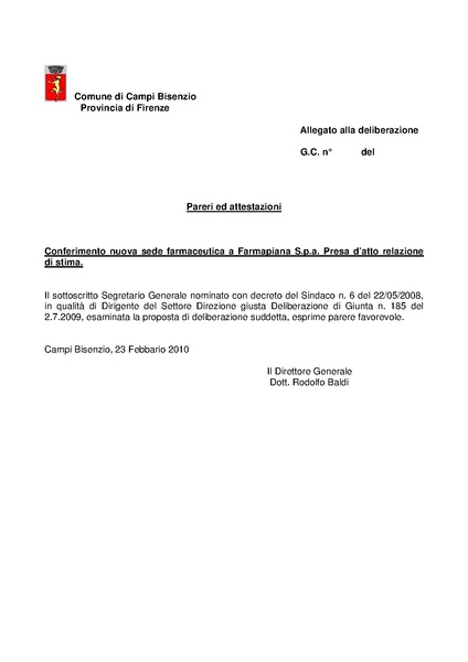 COMUNE DI CAMPI BISENZIO - DELIBERAZIONE DELLA GIUNTA COMUNALE N. 48 DEL 23/02/2010 - CONFERIMENTO NUOVA SEDE FARMACEUTICA A FARMAPIANA S.P.A. PRESA D'ATTO DELLA RELAZIONE DI STIMA.