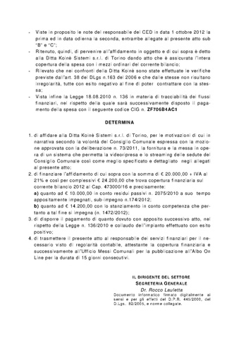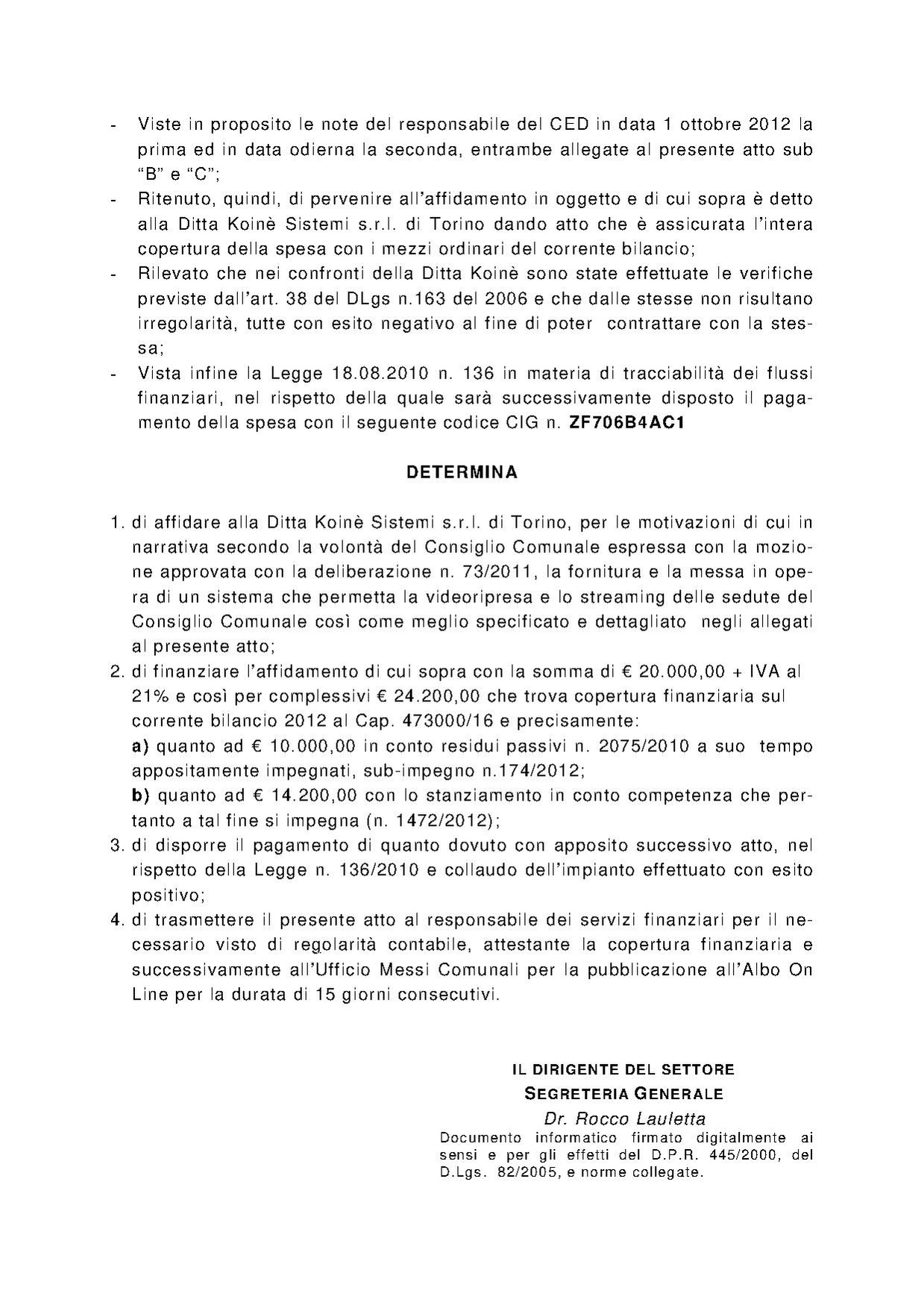 Comune di Scandicci - DETERMINAZIONE N .28 DEL 19-11-2012 - Fornitura e messa in opera di un sistema che permette videoripresa e lo streaming delle sedute del Consiglio Comunale. Affidamento