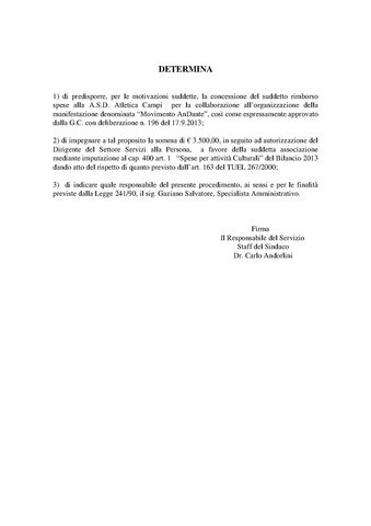 DETERMINAZIONE N. 28 DEL 18/09/2013 - Settore: Staff del Sindaco - Comunicazione e Partecipazione - Concessione rimborso spese alla A.S.D. Atletica Campi per la collaborazione nell'organizzazione della manifestazione "Movimento AnDante". Impegno di spesa