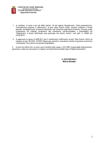 COMUNE DI CAMPI BISENZIO - DETERMINAZIONE N. 82 DEL 08/10/2013 - Settore: Direzione - CONFERIMENTO INCARICO AL PROF. GIAN FRANCO CARTEI QUALE COMPONENTE DEL COLLEGIO COMPETENTE ALLA VALUTAZIONE SULL’AMMISSIBILITÀ E PROPONIBILITÀ DEL “REFERENDUM A FAVORE DELL’ATTUALE AREA PEDONALE NEL CENTRO STORICO”. CIG: 5362015ABF.