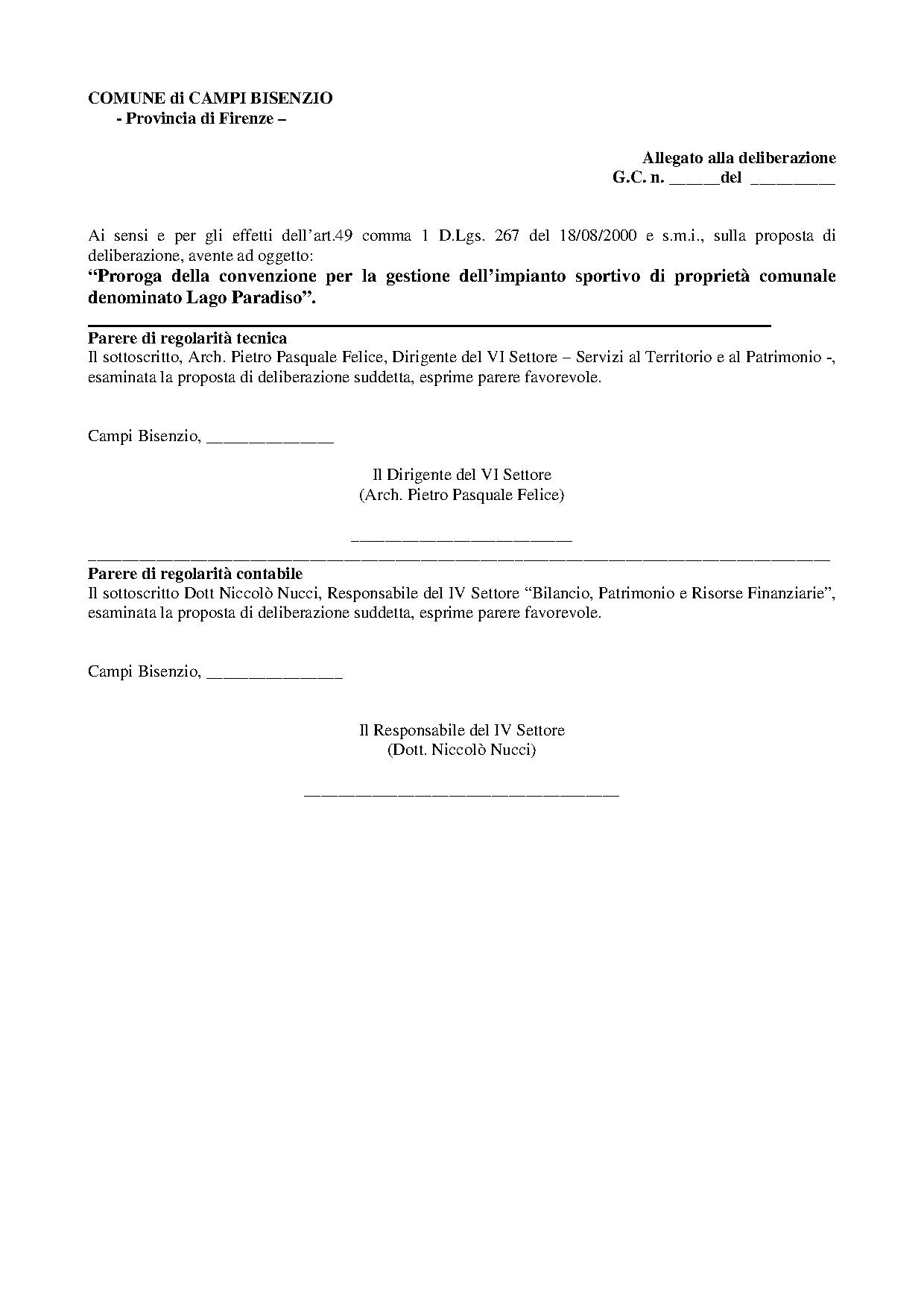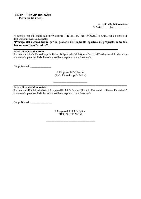 COMUNE DI CAMPI BISENZIO - Provincia di Firenze - DELIBERAZIONE DELLA GIUNTA COMUNALE N. 298 DEL 31/12/2013 - Proroga della convenzione per la gestione dell’impianto sportivo di proprietà comunale denominato Lago Paradiso.