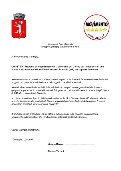 Consiglio Comunale Campi Bisenzio - 20 maggio 2014 - Emendamenti presentati dal MoVimento 5 Stelle su ODG per la richiesta di una nuova e più accurata Valutazione di Impatto Sanitario (VIS) per la piana fiorentina.