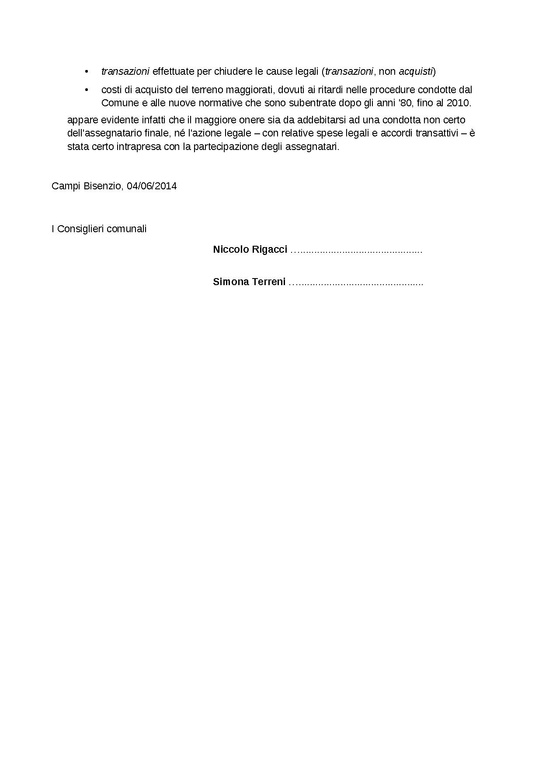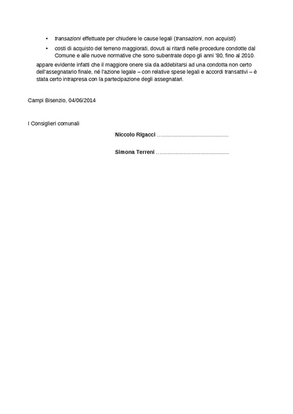 Comune di Campi Bisenzio - DELIBERAZIONE N. 74 DEL 2014-06-12 - Interrogazione circa un procedimento giudiziale tra proprietari aree PEEP e Comune, presentata dal gruppo consiliare "Movimento 5 Stelle" (prot.nr.33233 del 4.06.2014).