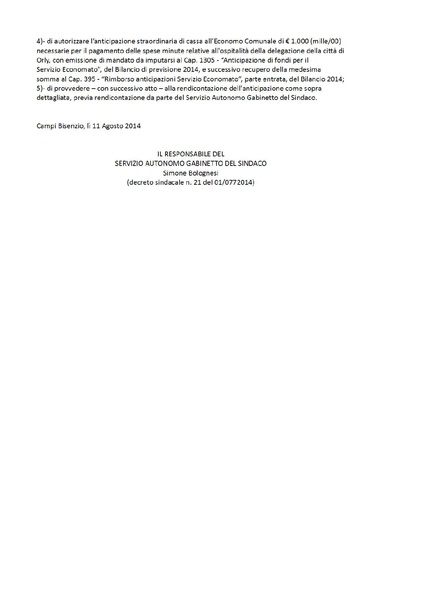 Comune di Campi Bisenzio - DETERMINAZIONE N. 6 DEL 2014-08-11 - Approvazione impegno di spesa e anticipazione all’Economo comunale di fondi per impegni istituzionali in occasione delle celebrazioni del 70° anniversario della Liberazione di Campi Bisenzio.