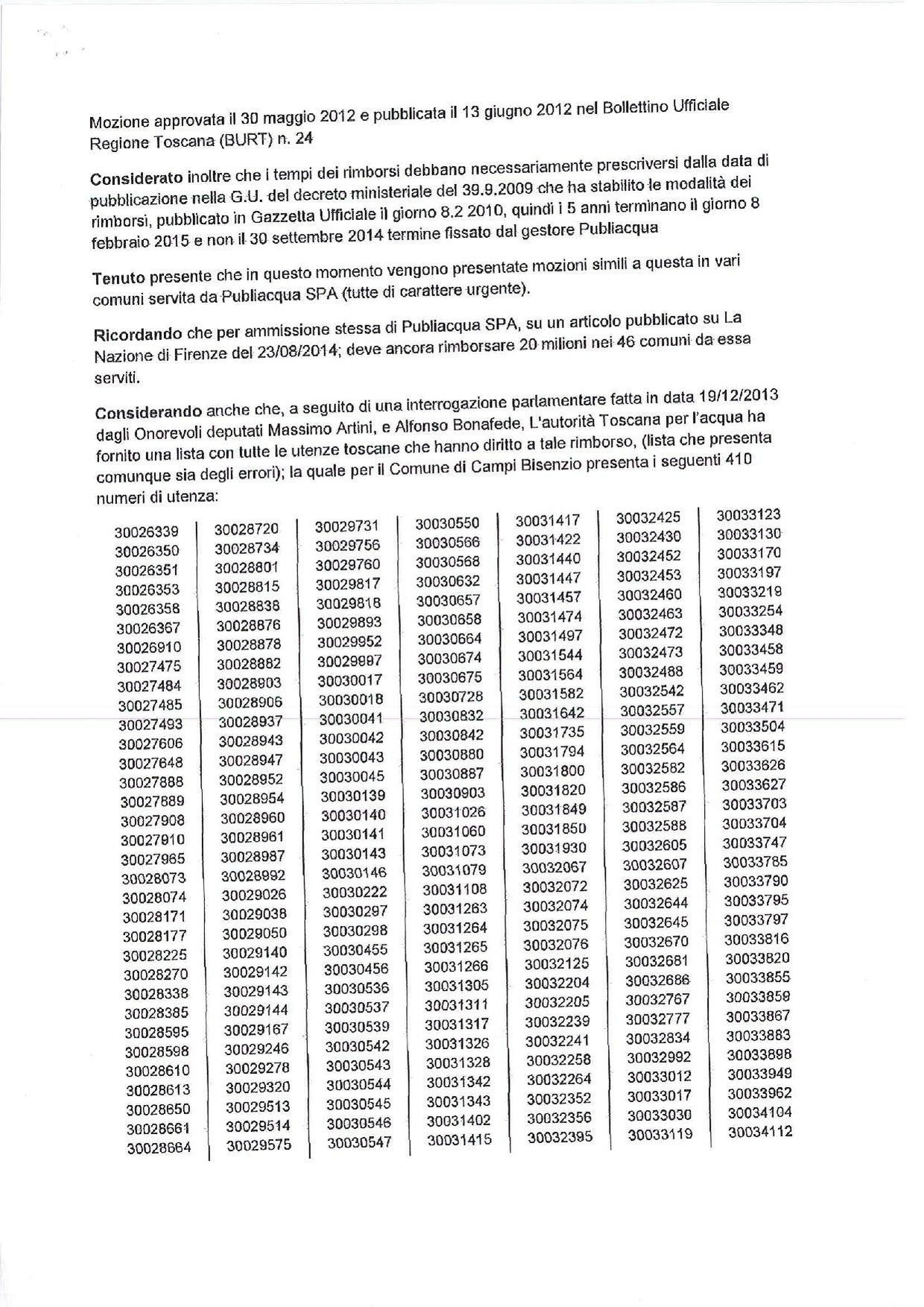 | attuale | 15:26, 29 set 2014 | 1 240 × 1 753, 10 pagine (1,21 MB) | WikiBotCampiB (discussione | contributi) | Comune di Campi Bisenzio - DELIBERAZIONE N. 144 DEL 2014-09-23 - Mozione di carattere urgente sull'applicazione della sentenza della Corte Costituzionale n.335/08 sul canone di depurazione riscosso impropriamente da Publiacqua SPA, presentata dal grupp... |