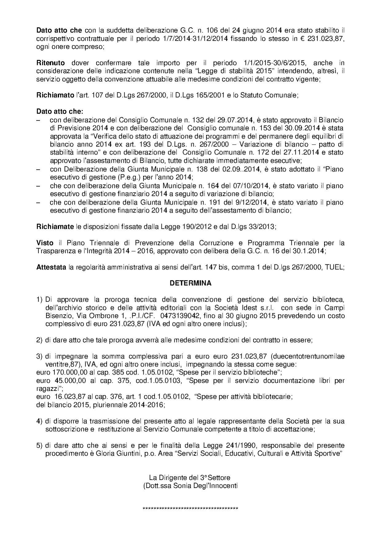 Comune di Campi Bisenzio - DETERMINAZIONE N. 173 DEL 2014-12-31 - Proroga contratto di servizio con Idest s.r.l .