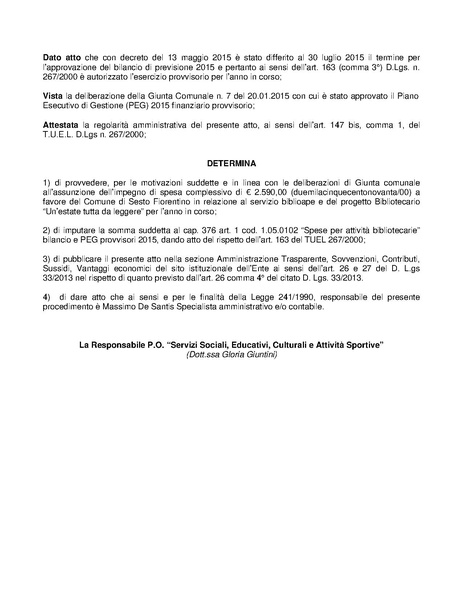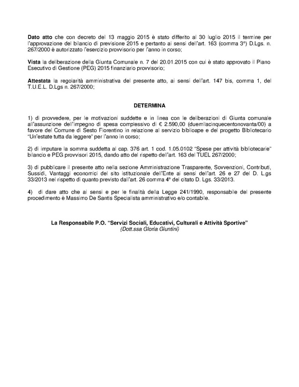 Comune di Campi Bisenzio - DETERMINAZIONE N. 326 DEL 2015-06-29 - Servizio di Biblioape in collaborazione con le biblioteche di Calenzano e Sesto Fiorentino e Progetto bibliotecario d?area ?Un?estate tutta da leggere? Impegno di spesa.