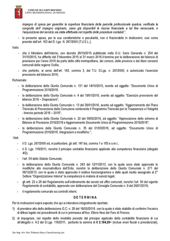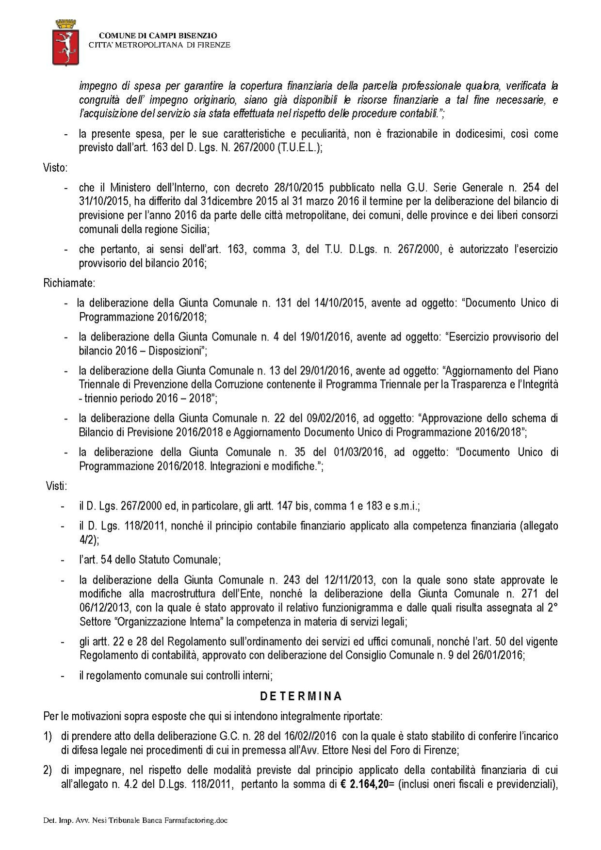 Comune di Campi Bisenzio - DETERMINAZIONE N. 148 DEL 2016-03-17 - Approvazione impegno di spesa per incarico legale ad Avv. Ettore Nesi nella proposizione di opposizione al Decreto ingiuntivo n. 7358/2015 del 30/12/2015 emesso dal Tribunale di Firenze nel procedimento R.G. 17018/2015 promosso da Banca Farmafactoring S.p.A.
