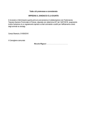 Ordine del Giorno richiedente l'interruzione ufficiale e per via scritta dell'impegno assunto con determinazione n. 457 del 14/07/2016, cioè della convenzione di collaborazione con Federcaccia Toscana Sezione Provinciale di Firenze per la promozione di cani ex randagi ricoverati in strutture convenzionate