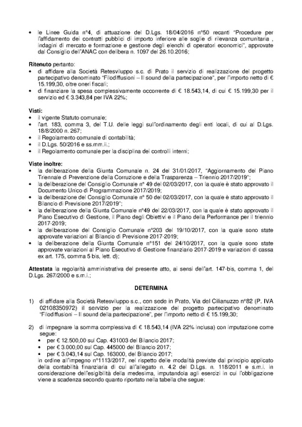 Comune di Campi Bisenzio - DETERMINAZIONE N. 831 DEL 2017-10-31 - Affidamento delle prestazioni relative alla realizzazione del progetto partecipativo denominato ?Filodiffusioni ? Il sound della partecipazione?. CIG n? Z55206D48A