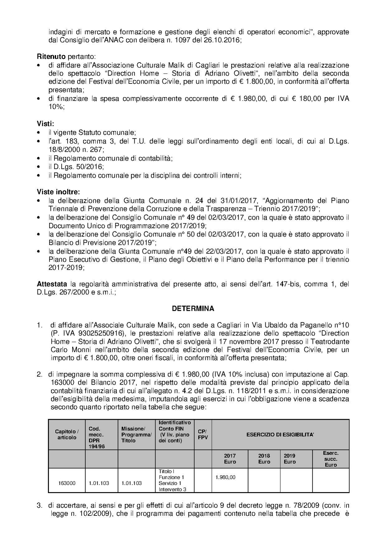 Comune di Campi Bisenzio - DETERMINAZIONE N. 837 DEL 2017-11-02 - Affidamento attivita di realizzazione dello spettacolo denominato ?DIRECTION HOME -- Storia di Adriano Olivetti?, nell?ambito della seconda edizione del Festival dell?Economia Civile. CIG n? Z97208E71D