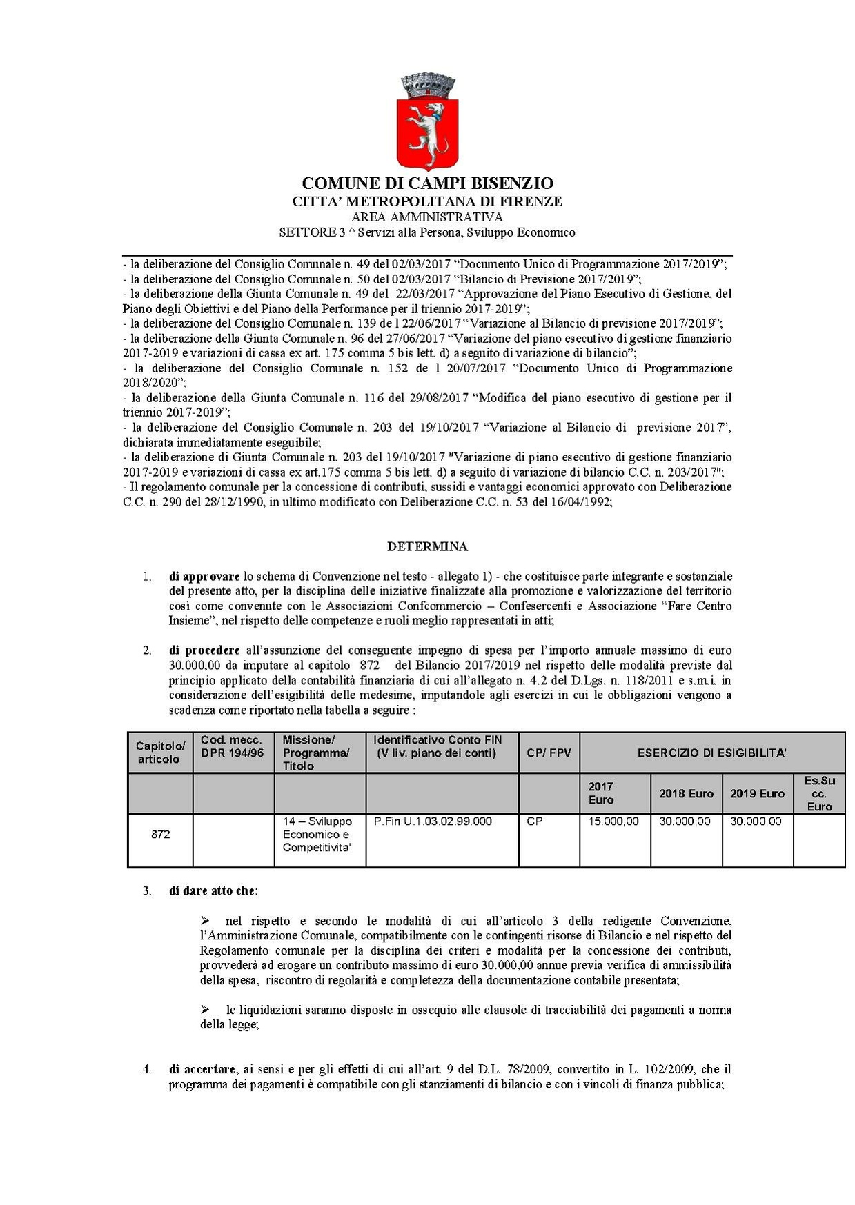 Comune di Campi Bisenzio - DETERMINAZIONE N. 850 DEL 2017-11-06 - CONVENZIONE TRA L'AMMINISTRAZIONE COMUNALE E LE ASSOCIAZIONI ?FARE CENTRO INSIEME?, CONFCOMMERCIO E CONFESERCENTI PER LA REALIZZAZIONE DI INIZIATIVE FINALIZZATE ALLA PROMOZIONE E VALORIZZAZIONE DEL TERRITORIO. APPROVAZIONE SCHEMA DI CONVENZIONE ED IMPEGNO DI SPESA.