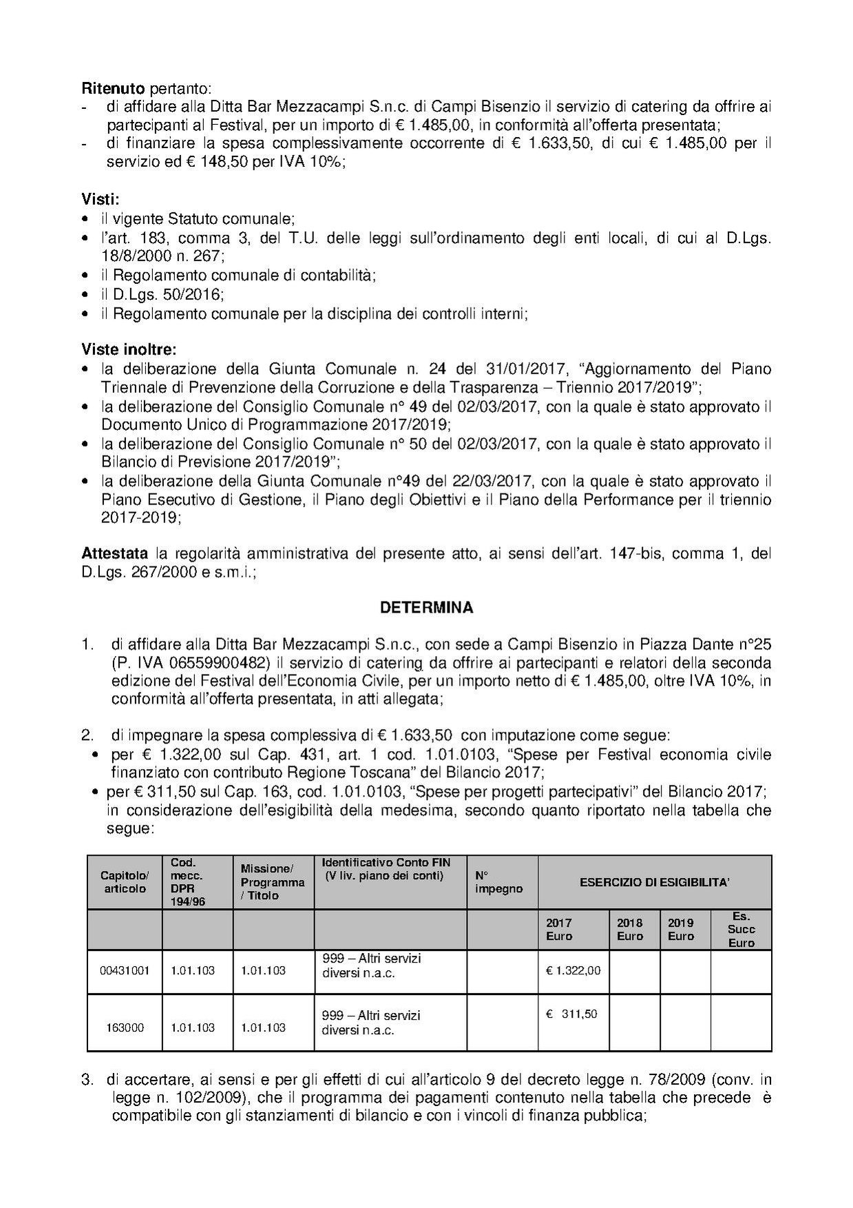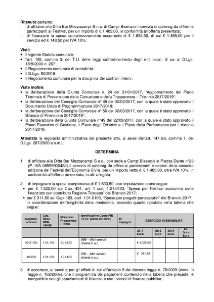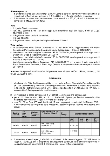 Comune di Campi Bisenzio - DETERMINAZIONE N. 878 DEL 2017-11-15 - Affidamento del servizio di catering nell?ambito della seconda edizione del Festival dell?Economia Civile - CIG n?Z4420BE023
