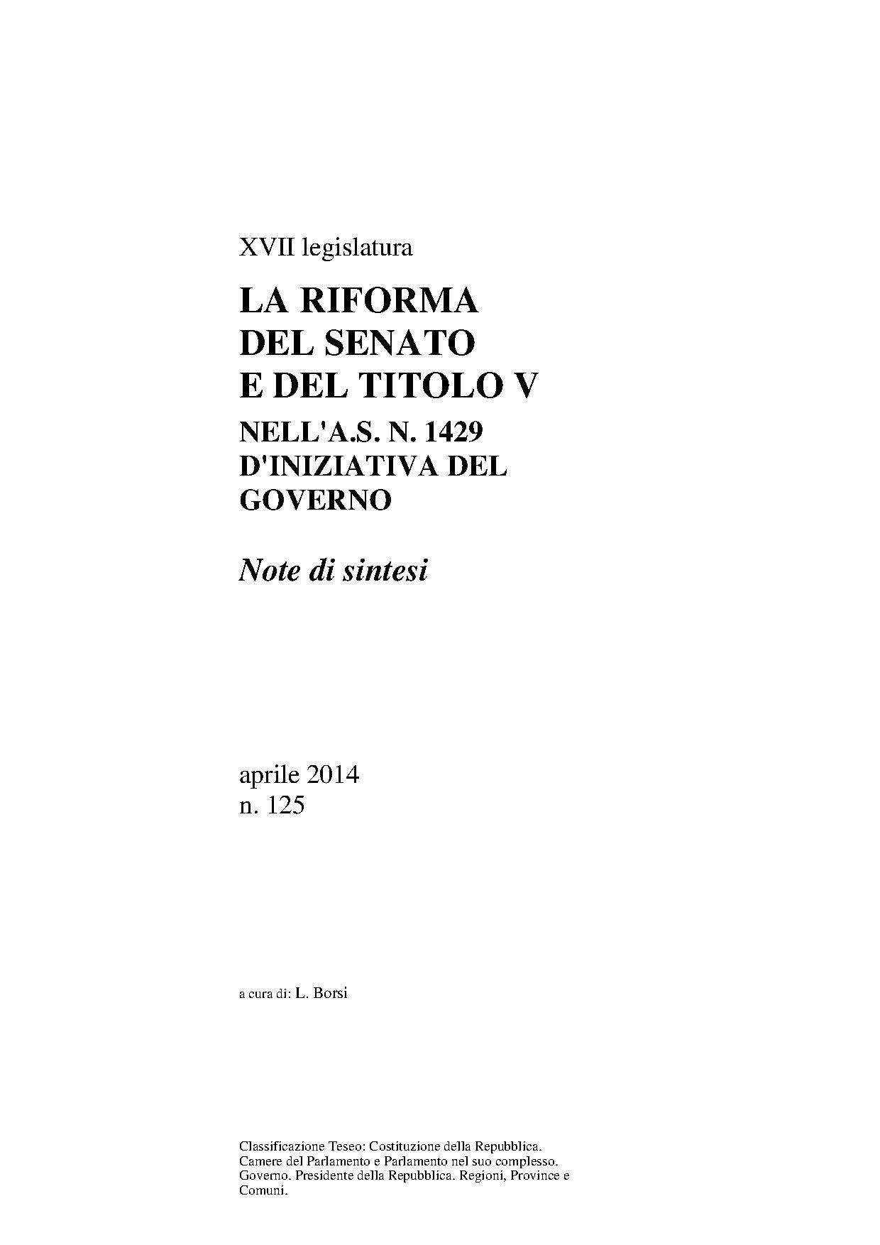 Dossier - LA RIFORMA DEL SENATO E DEL TITOLO V NELL'A.S. N. 1429 D'INIZIATIVA DEL GOVERNO - Note di sintesi