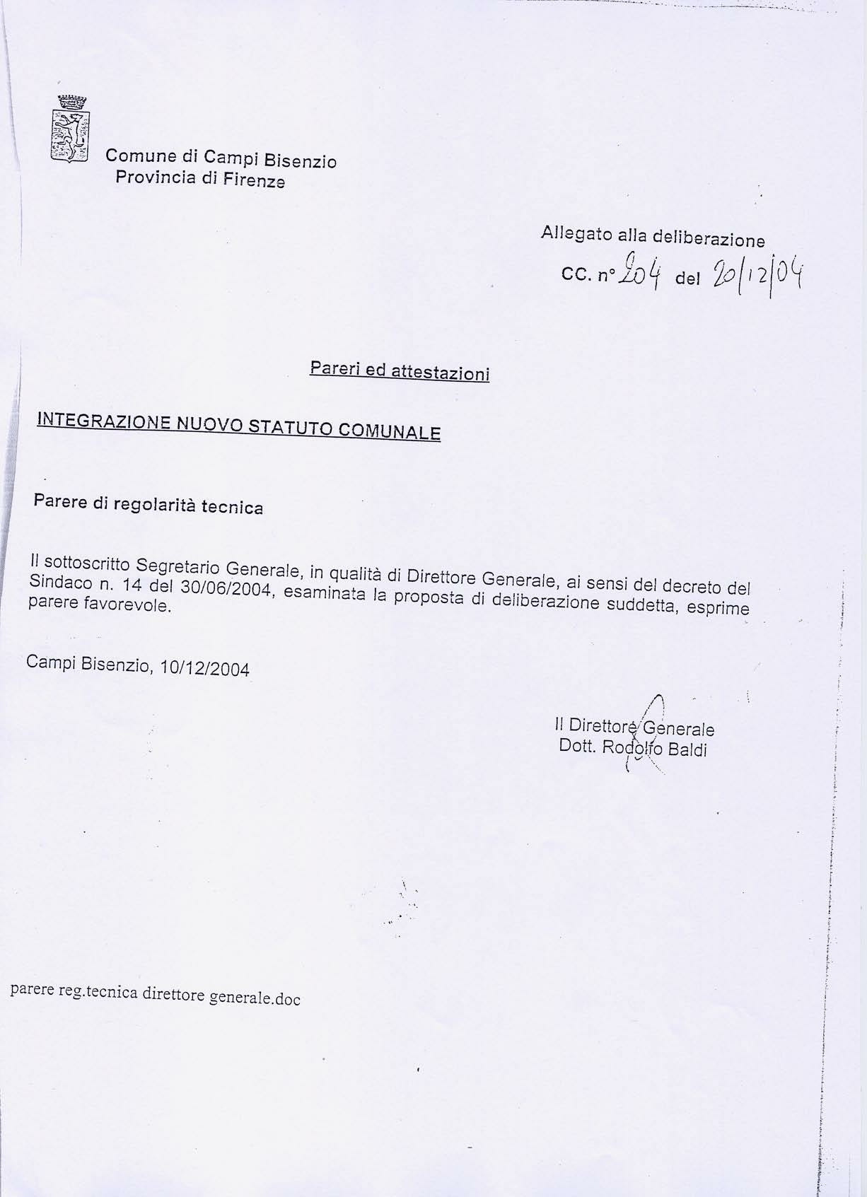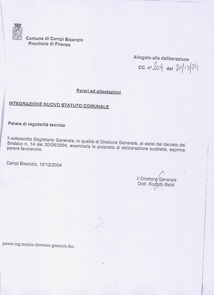 Comune di Campi Bisenzio, deliberazione n.204 del 2004-12-20 integrativa allo Statuto comunale