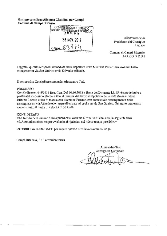 DELIBERAZIONE DEL CONSIGLIO COMUNALE N. 144 DEL 26/11/2013 - Quesiti a risposta immediata.