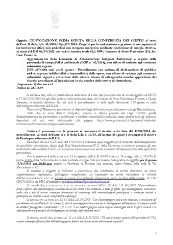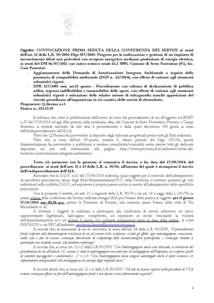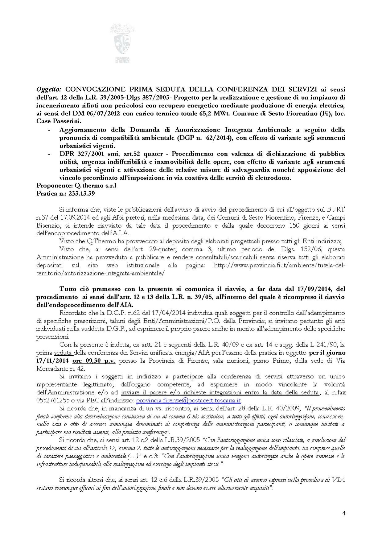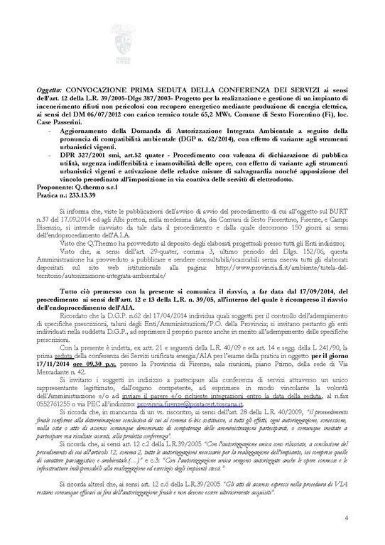 Provincia di Firenze - Prot. N° 0452060 DEL 10/10/2014 - CONVOCAZIONE PRIMA SEDUTA DELLA CONFERENZA DEI SERVIZI ai sensi dell’art. 12 della L.R. 39/2005-Dlgs 387/2003- Progetto per la realizzazione e gestione di un impianto di incenerimento rifiuti non pericolosi con recupero energetico mediante produzione di energia elettrica, ai sensi del DM 06/07/2012 con carico termico totale 65,2 MWt. Comune di Sesto Fiorentino (Fi), loc. Case Passerini. - Proponente: Q.thermo s.r.l