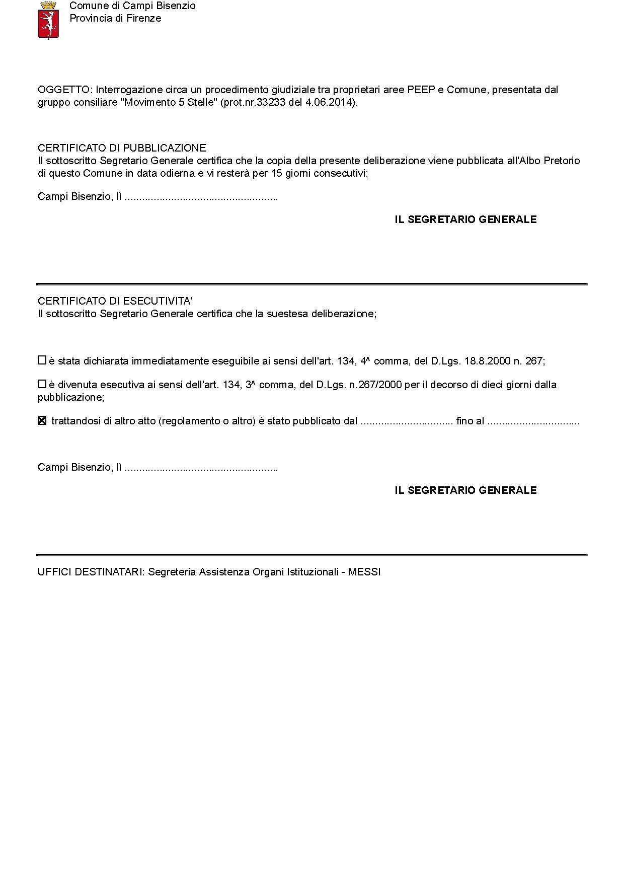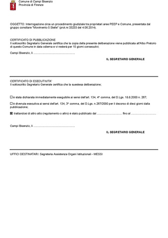 Comune di Campi Bisenzio - DELIBERAZIONE N. 74 DEL 2014-06-12 - Interrogazione circa un procedimento giudiziale tra proprietari aree PEEP e Comune, presentata dal gruppo consiliare "Movimento 5 Stelle" (prot.nr.33233 del 4.06.2014).