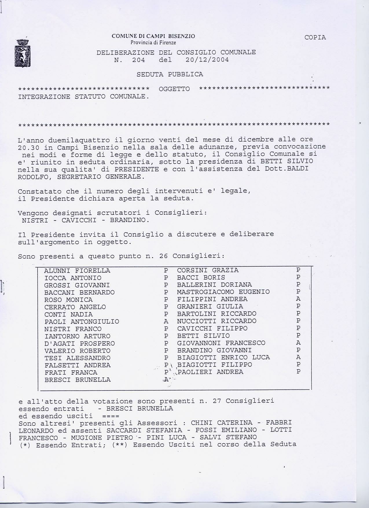 Comune di Campi Bisenzio, deliberazione n.204 del 2004-12-20 integrativa allo Statuto comunale