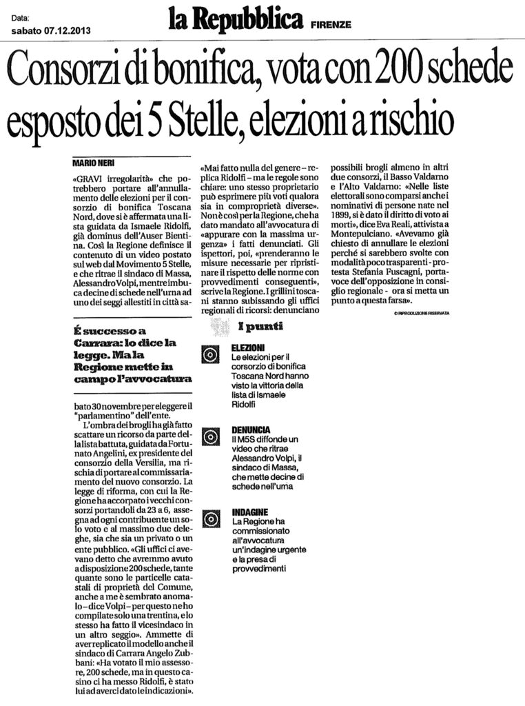 Consorzi di bonifica, vota con 200 schede esposto dei 5 Stelle, elezioni a rischio - La Repubblica, 7 dicembre 2013