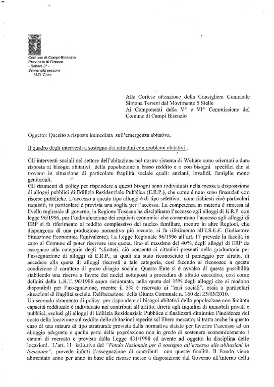 Relazione in risposta al quesito su emergenza abitativa - 13 dicembre 2013