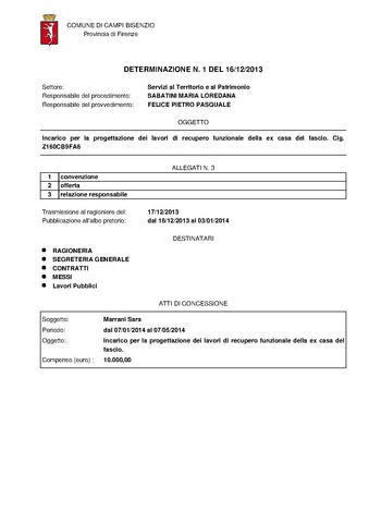 Comune di Campi Bisenzio - DETERMINAZIONE N. 1 DEL 2013-12-16 - Incarico per la progettazione dei lavori di recupero funzionale della ex casa del fascio. Cig. Z160CB9FA6