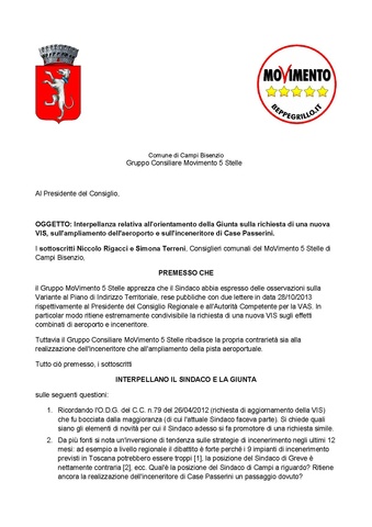 Consiglio Comunale Campi Bisenzio - 17 dicembre 2013 - Interpellanza relativa all'orientamento della Giunta sulla richiesta di una nuova VIS, sull'ampliamento dell'aeroporto e sull'inceneritore di Case Passerini.