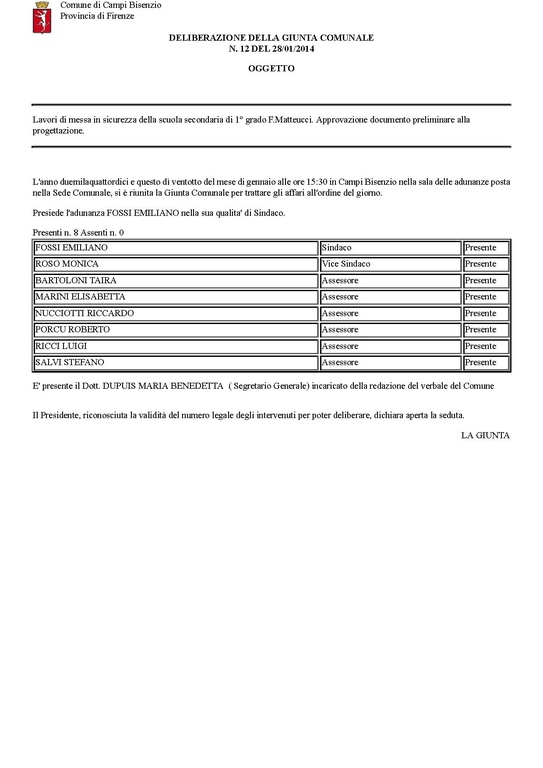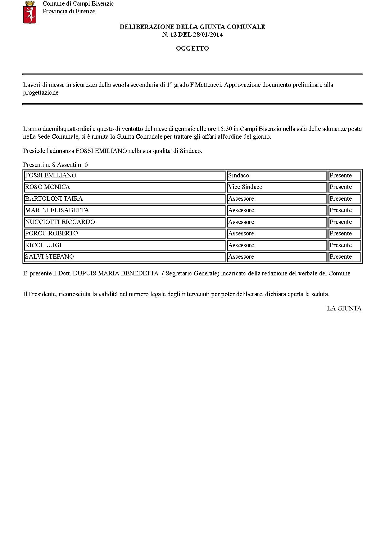 Comune di Campi Bisenzio - DELIBERAZIONE DELLA GIUNTA COMUNALE N. 12 DEL 28/01/2014 - Lavori di messa in sicurezza della scuola secondaria di 1° grado F.Matteucci. Approvazione documento preliminare alla progettazione.