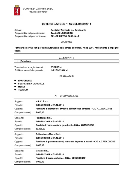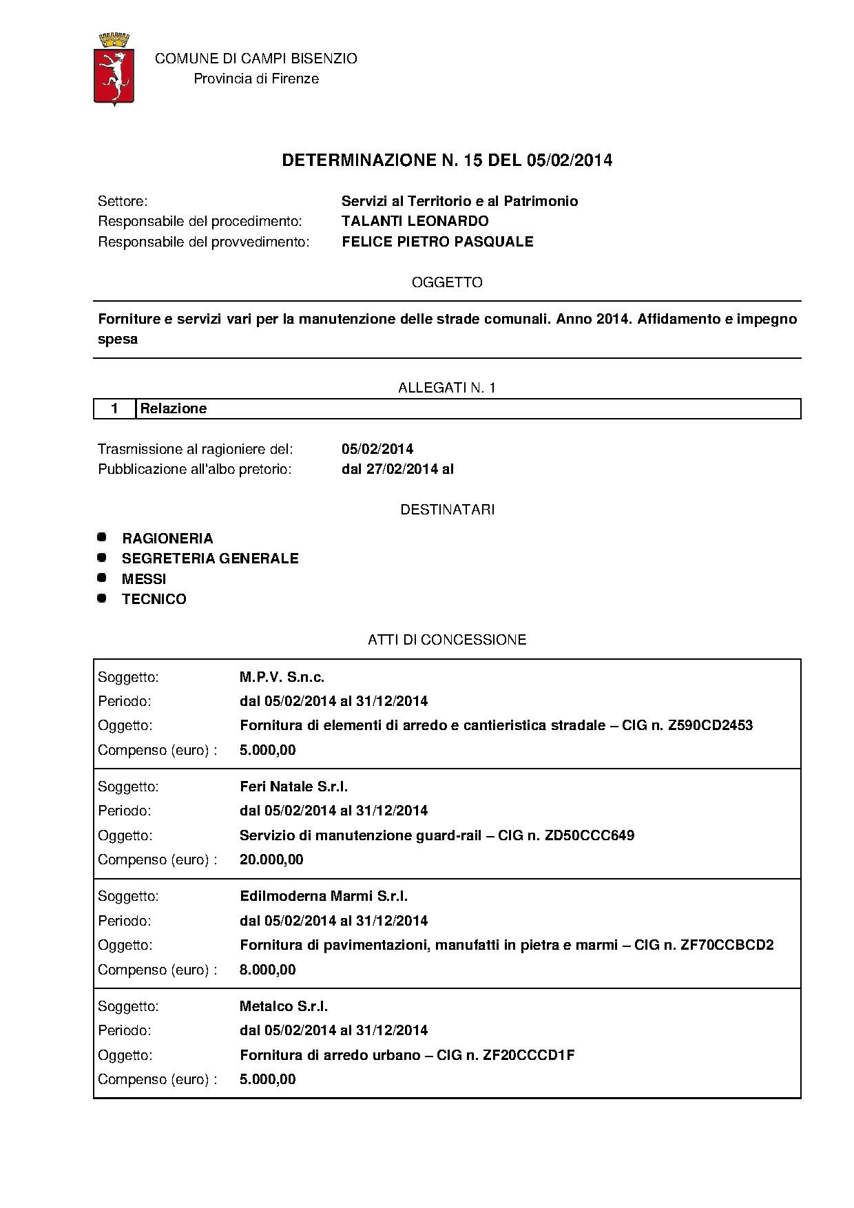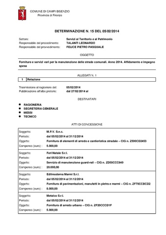 Comune di Campi Bisenzio - DETERMINAZIONE N. 15 DEL 2014-02-05 - Forniture e servizi vari per la manutenzione delle strade comunali. Anno 2014. Affidamento e impegno spesa