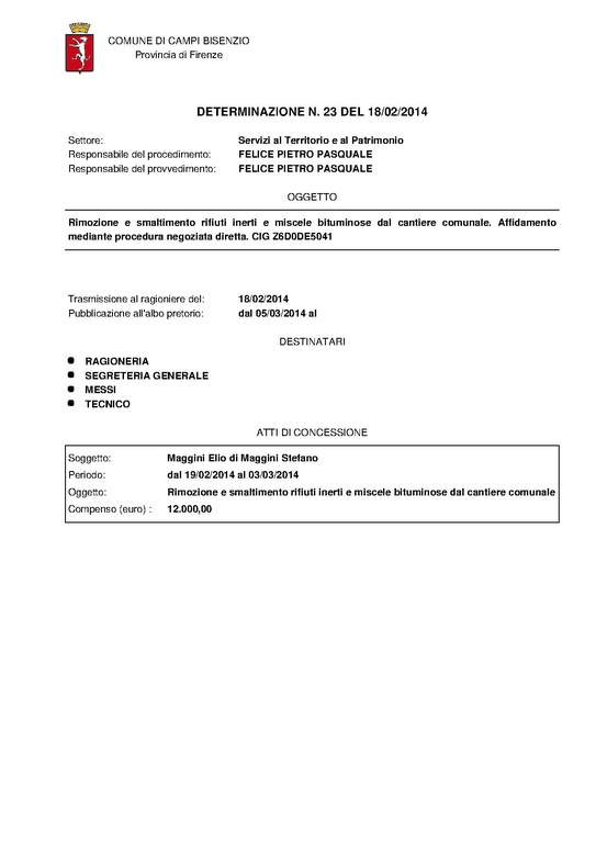 Comune di Campi Bisenzio - DETERMINAZIONE N. 23 DEL 2014-02-18 - Rimozione e smaltimento rifiuti inerti e miscele bituminose dal cantiere comunale. Affidamento mediante procedura negoziata diretta. CIG Z6D0DE5041