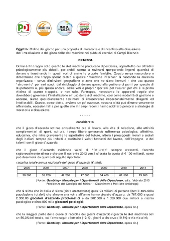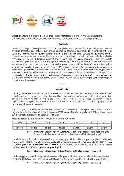 Comune di Campi Bisenzio - Consiglio Comunale - 25 febbraio 2014 - Ordine del giorno per una proposta di moratoria e di incentivo alla dissuasione dell’installazione e del gioco delle slot machine nei pubblici esercizi di Campi Bisenzio