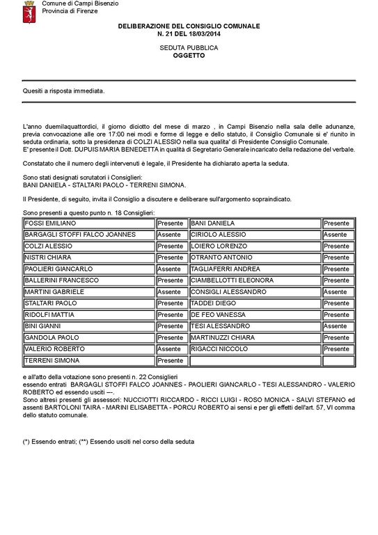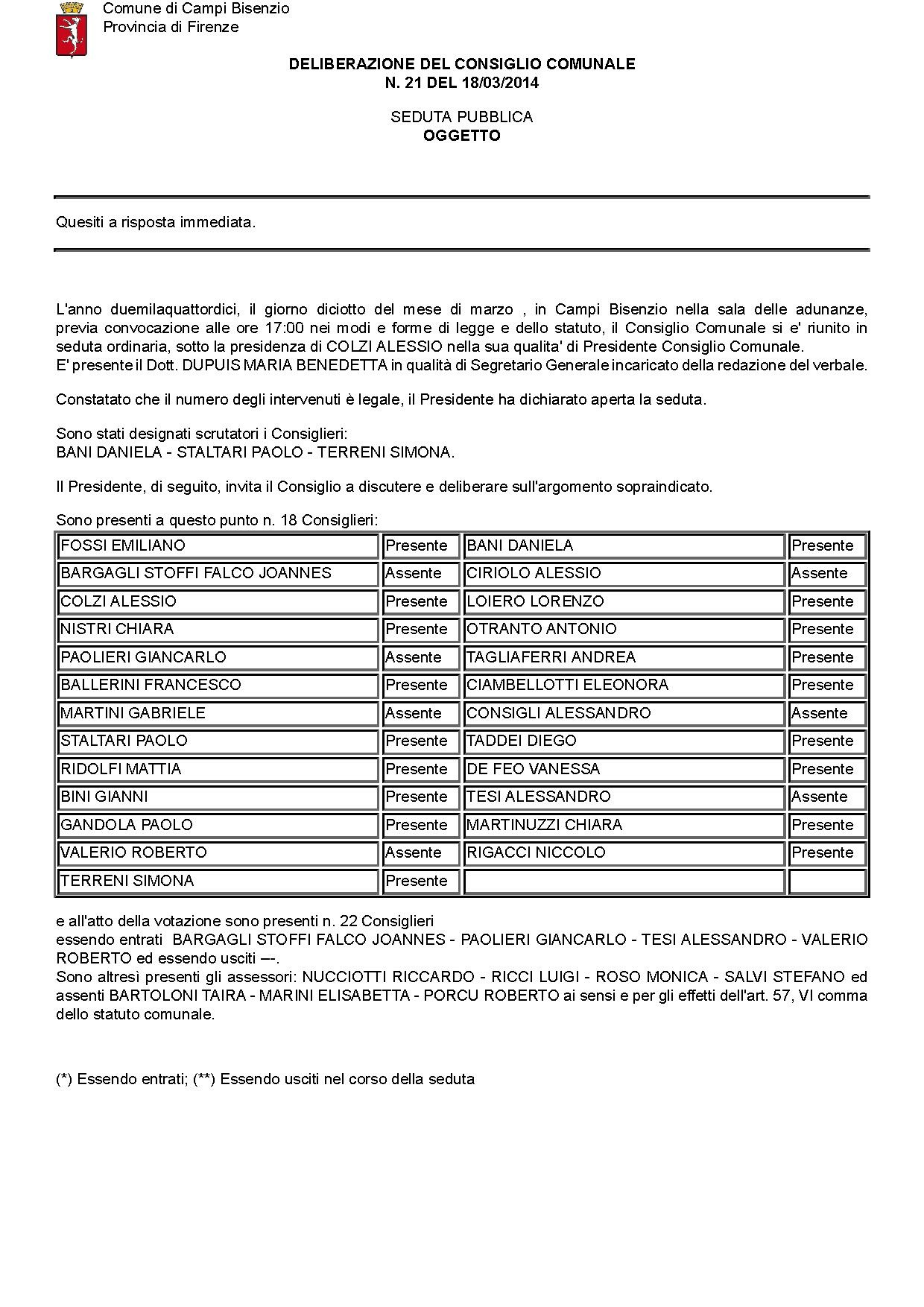 Comune di Campi Bisenzio - DELIBERAZIONE N. 21 DEL 2014-03-18 - Quesiti a risposta immediata.