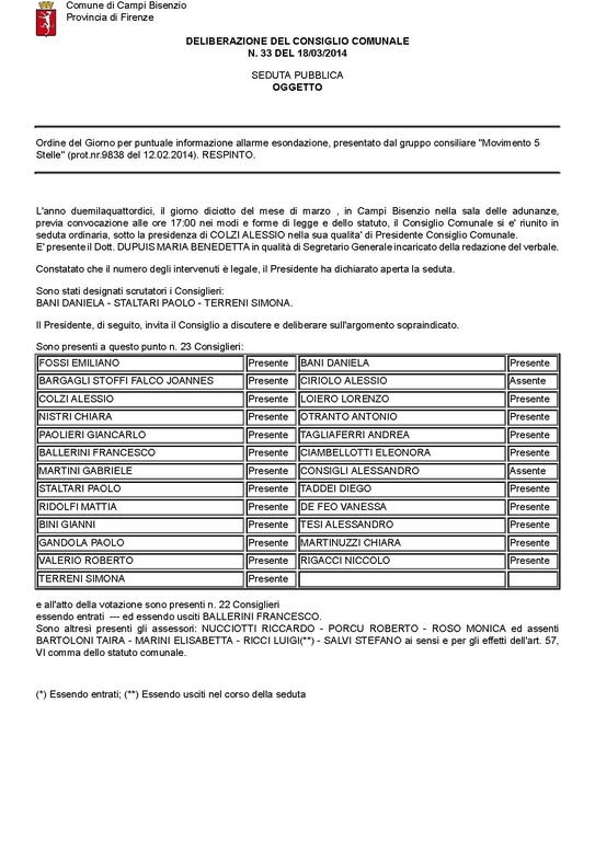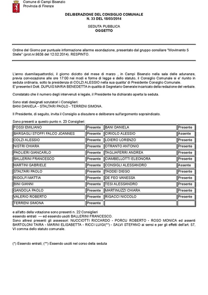 Comune di Campi Bisenzio - DELIBERAZIONE DEL CONSIGLIO COMUNALE N. 33 DEL 18/03/2014 - Ordine del Giorno per puntuale informazione allarme esondazione, presentato dal gruppo consiliare Movimento 5 Stelle (prot.nr.9838 del 12.02.2014). RESPINTO.