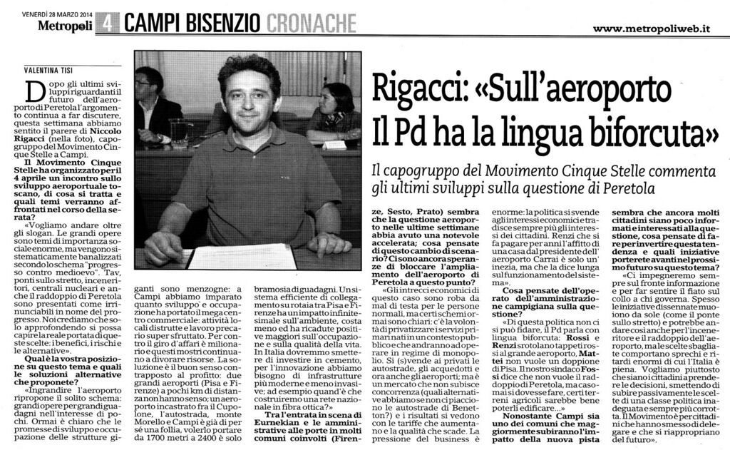 Rigacci: "Sull'aeroporto il Pd ha la lingua biforcuta" - Metropoli - 28 marzo 2014