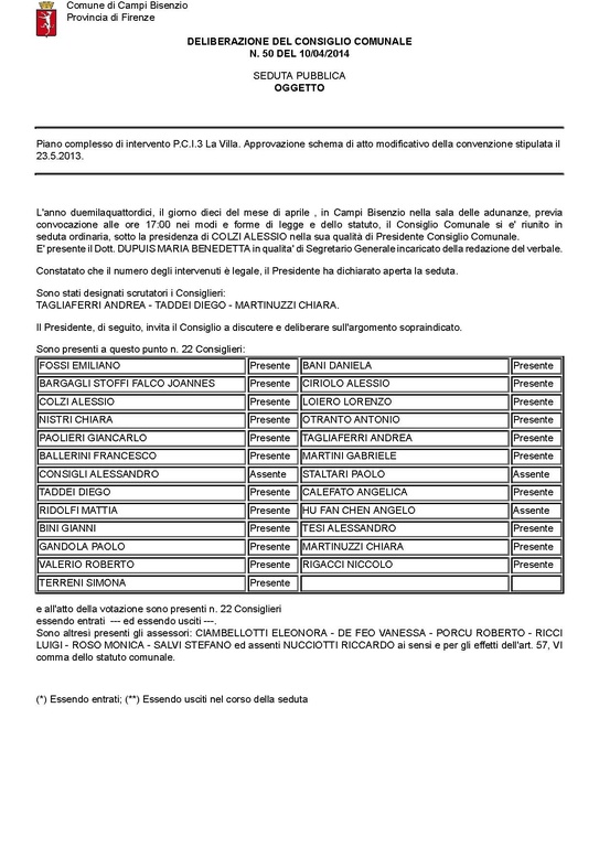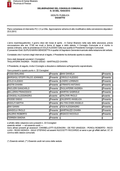 DELIBERAZIONE DEL CONSIGLIO COMUNALE N. 50 DEL 10/04/2014 - Piano complesso di intervento P.C.I.3 La Villa. Approvazione schema di atto modificativo della convenzione stipulata il 23.5.2013.