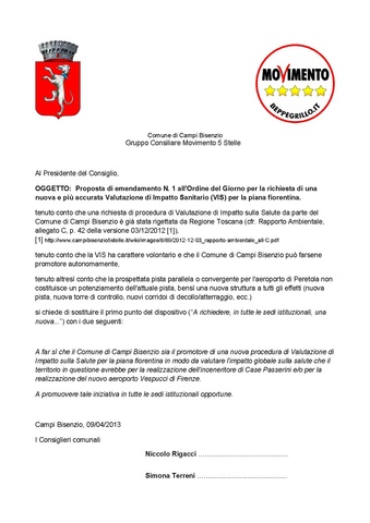 Consiglio Comunale Campi Bisenzio - 20 maggio 2014 - Emendamenti presentati dal MoVimento 5 Stelle su ODG per la richiesta di una nuova e più accurata Valutazione di Impatto Sanitario (VIS) per la piana fiorentina.