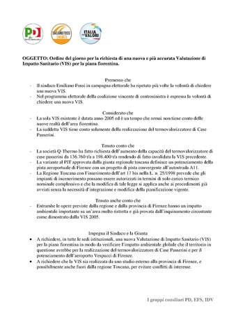 Ordine del giorno per la richiesta di una nuova e più accurata Valutazione di Impatto Sanitario (VIS) per la piana fiorentina.
