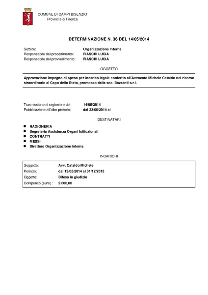 Comune di Campi Bisenzio - DETERMINAZIONE N. 36 DEL 2014-05-14 - Approvazione impegno di spesa per incarico legale conferito all'Avvocato Michele Cataldo nel ricorso straordinario al Capo dello Stato, promosso dalla soc. Bazzanti s.r.l.