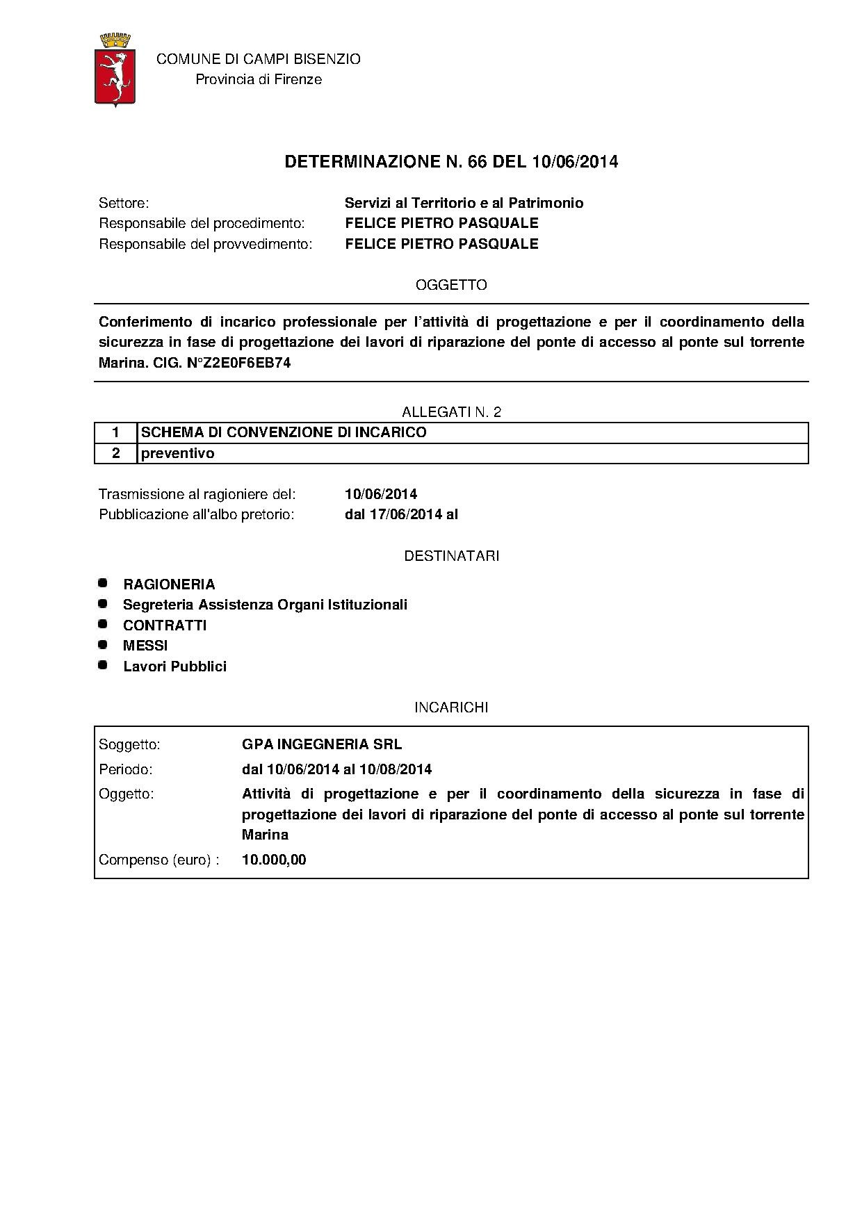 Comune di Campi Bisenzio - DETERMINAZIONE N. 66 DEL 2014-06-10 - Conferimento di incarico professionale per l’attività di progettazione e per il coordinamento della sicurezza in fase di progettazione dei lavori di riparazione del ponte di accesso al ponte sul torrente Marina. CIG. N°Z2E0F6EB74