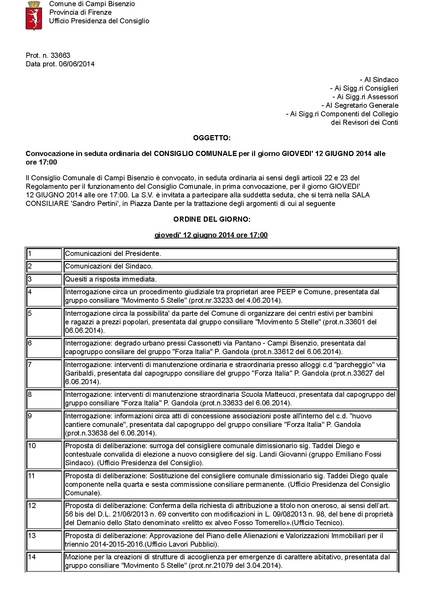 Comune di Campi Bisenzio - Convocazione in seduta ordinaria del CONSIGLIO COMUNALE per il giorno GIOVEDI' 12 GIUGNO 2014 alle ore 17:00
