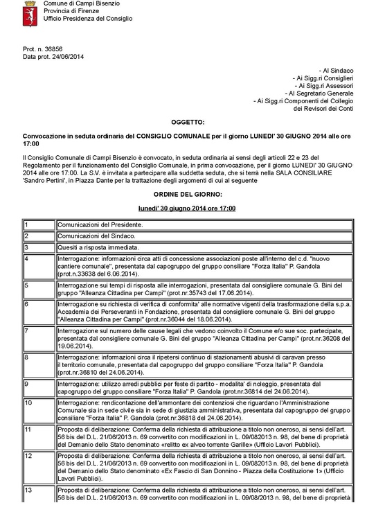 Campi Bisenzio - Consiglio comunale del 30 giugno 2014 - Ordine del giorno