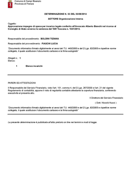 Comune di Campi Bisenzio - DETERMINAZIONE N. 55 DEL 2014-08-05 - Approvazione impegno di spesa per incarico legale conferito all'Avvocato Alberto Bianchi nel ricorso al Consiglio di Stato avverso la sentenza del TAR Toscana n. 1591/2013.